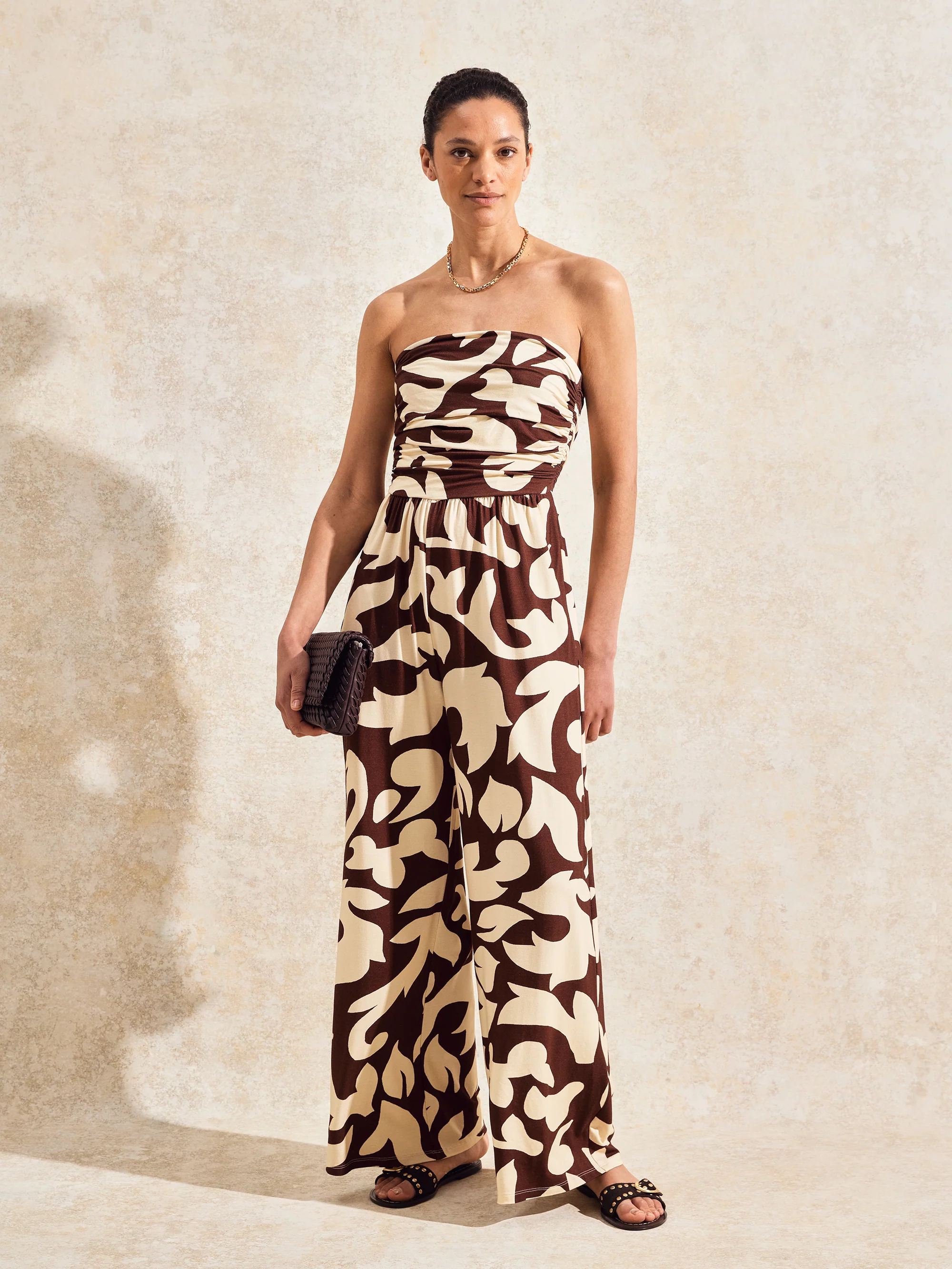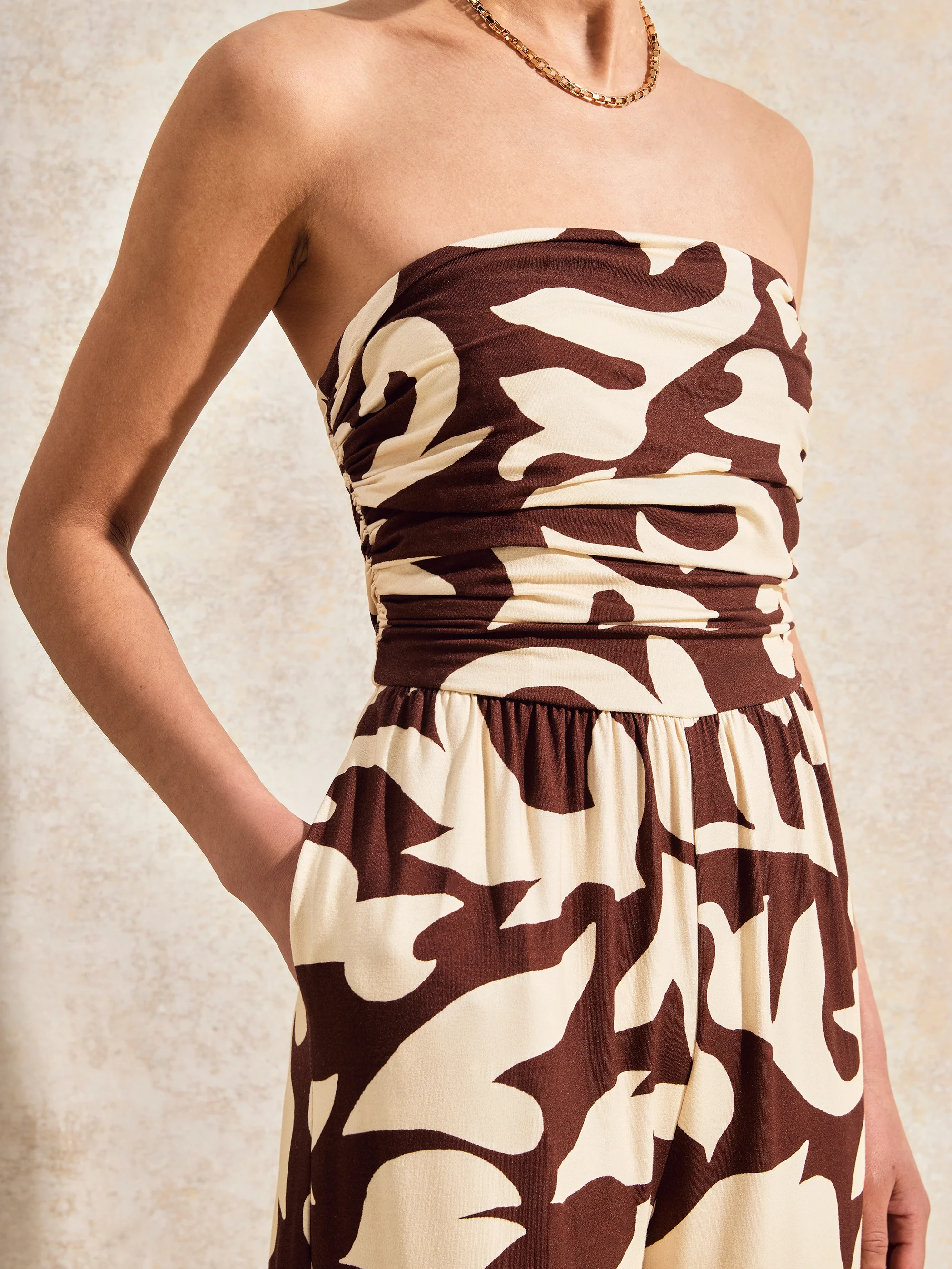 Brown And Cream Abstract-Print Bandeau Jumpsuit