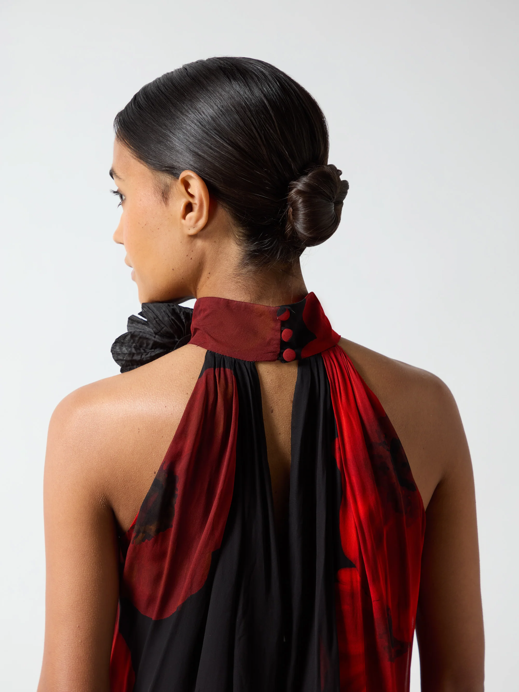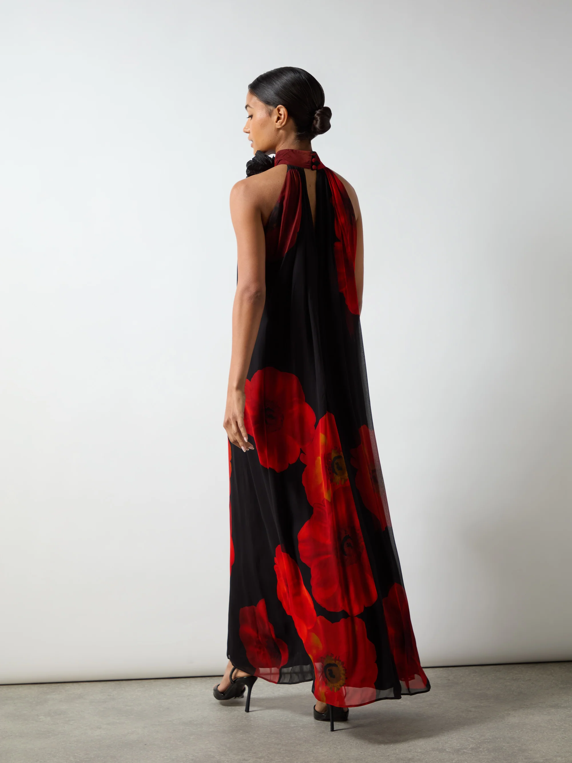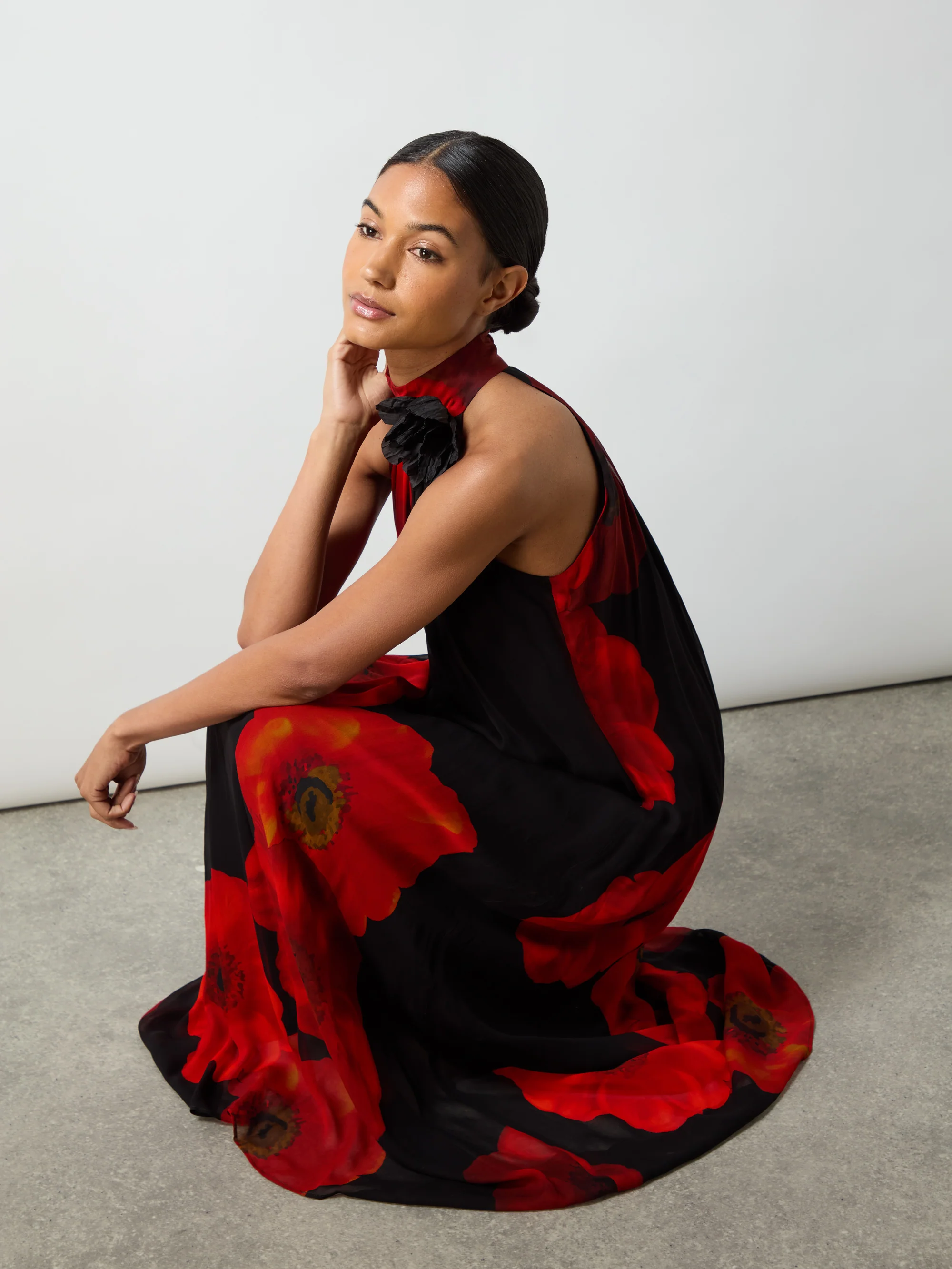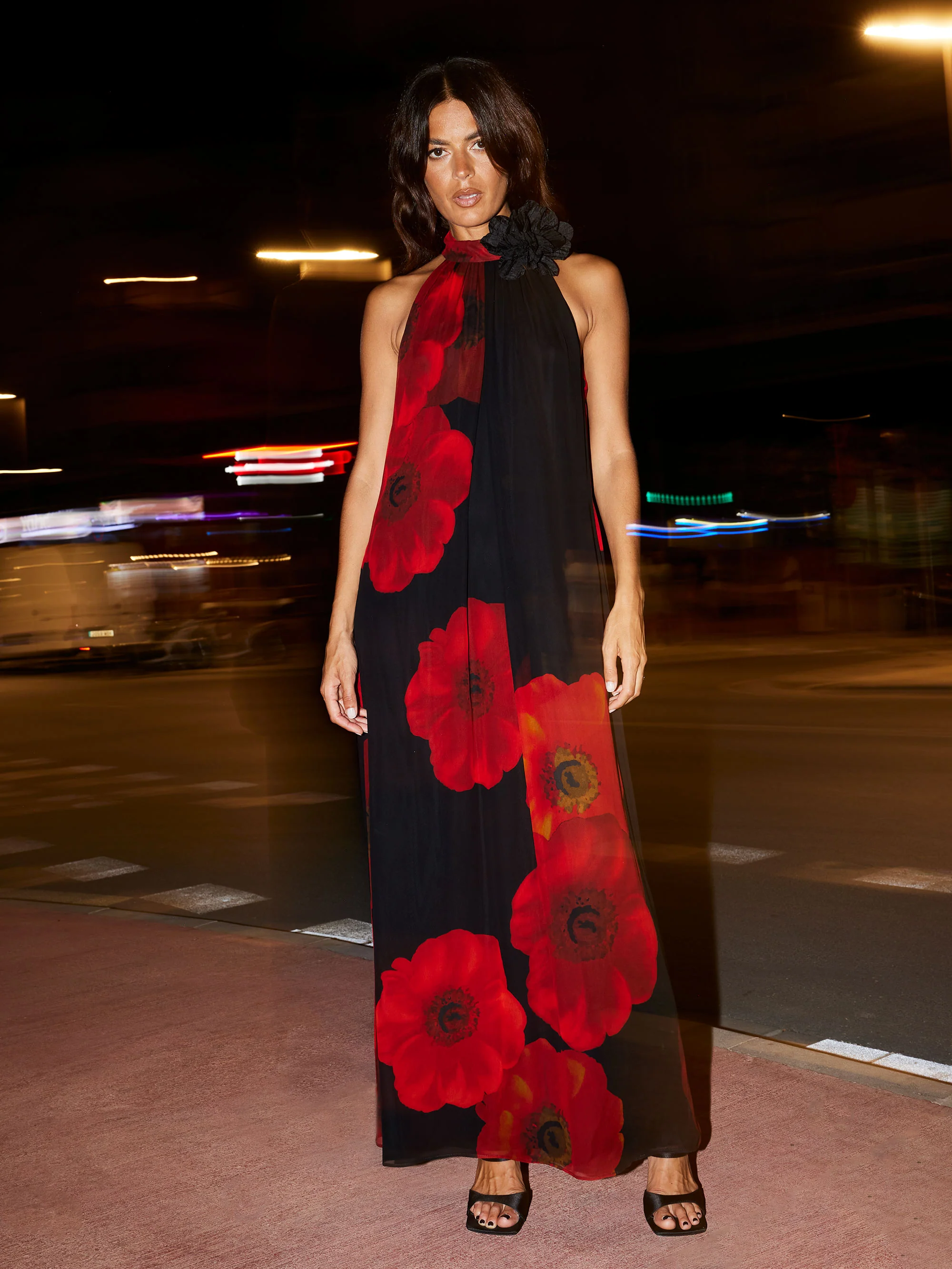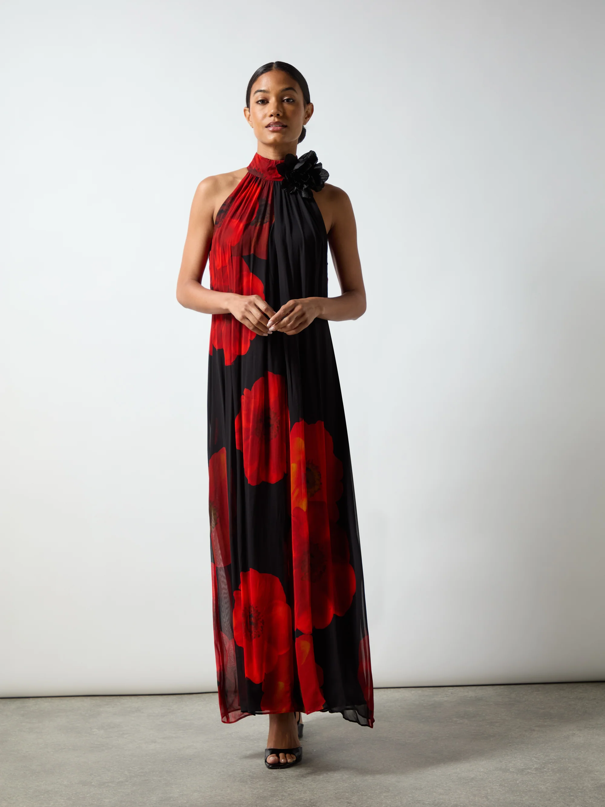 Isabella Red Floral Print Corsage Trim Maxi Dress