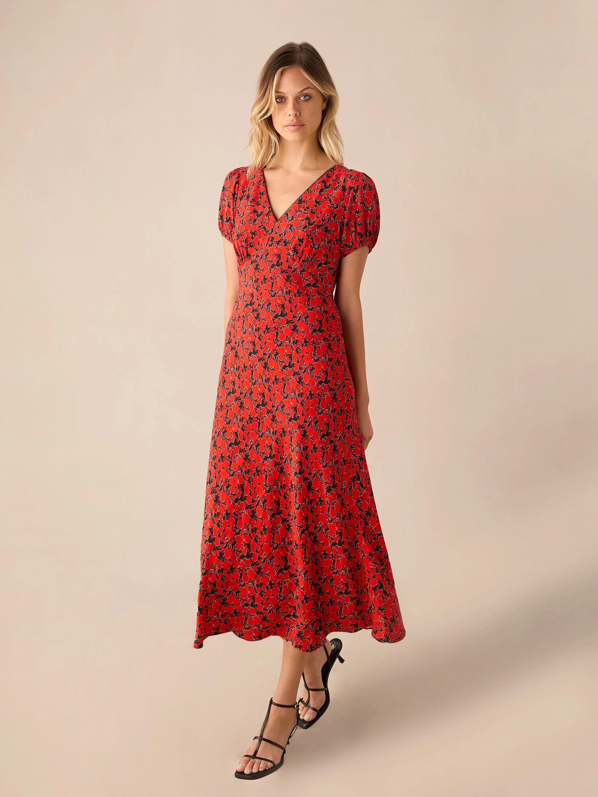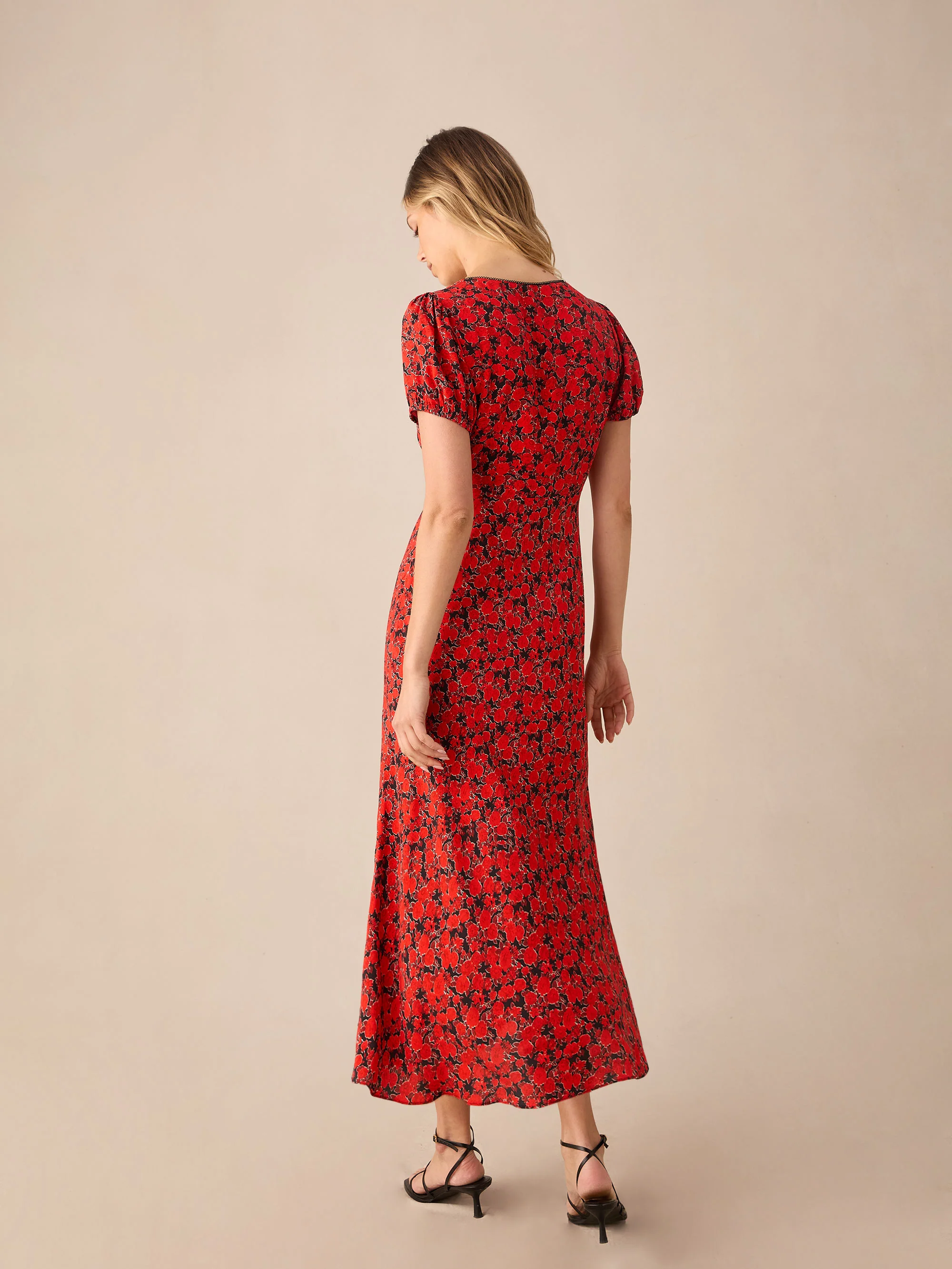 Red Blurred Floral Print Puff Sleeve Midi Dress